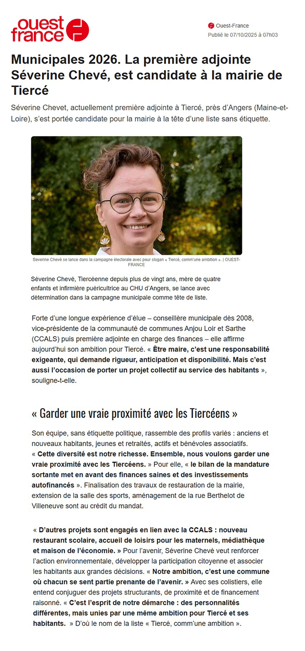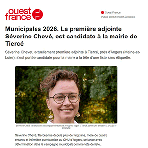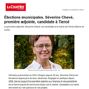 Infirmière puéricultrice au CHU d’Angers depuis vingt-cinq ans, Séverine Chevé met en avant son attachement profond au territoire, la proximité avec les Tiercéennes et Tiercéens, et la volonté de maintenir un dialogue constant avec chacun.