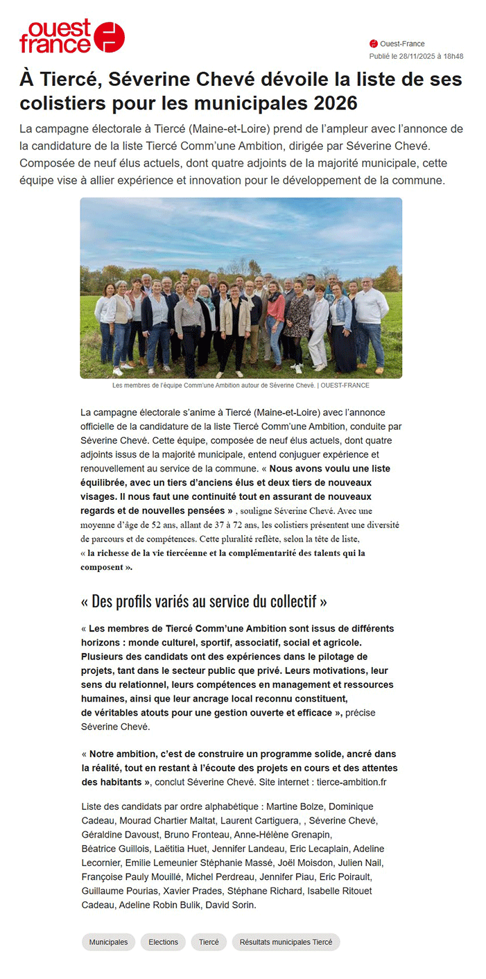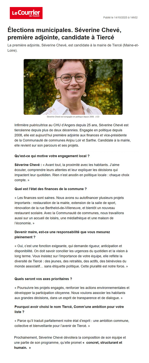 Séverine Chevé, première adjointe aux finances et engagée depuis de nombreuses années dans la vie publique, annonce officiellement sa candidature aux élections municipales de 2026 à Tiercé. Installée dans la commune depuis plus de vingt ans et investie en politique locale depuis 2008, elle souhaite poursuivre son action au service des habitants et de l’intérêt général.